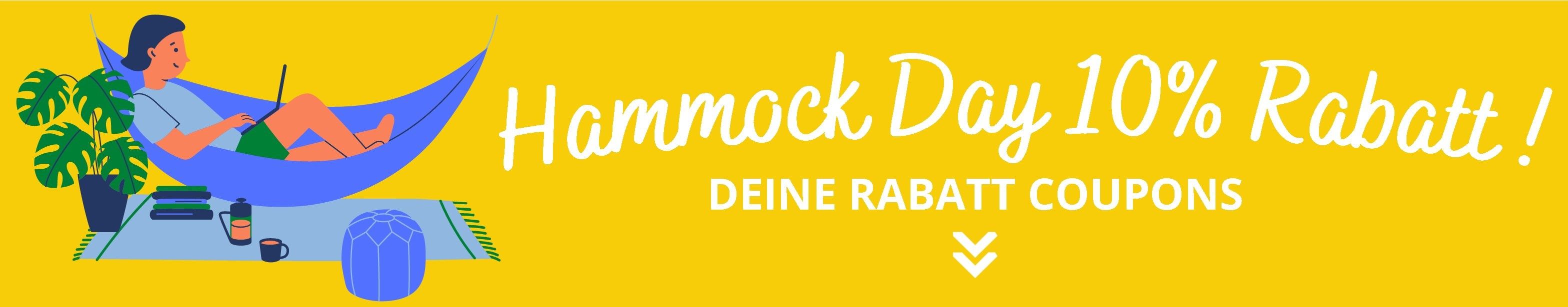 Tag der Hängematte - der richtige Zeitpunkt um abzuhängen. Ob eine , einen für zu Hause, oder für Dein nächstes Camping-Abenteuer. Jetzt nochmals günstiger mit dem passenden Code* den du beim Warenkorb einlösen kannst. Gültig für ALLE Hängematten, Hängesessel, Hängehöhlen, Zelte, Tarps, Gestelle der jeweiligen Hersteller!*